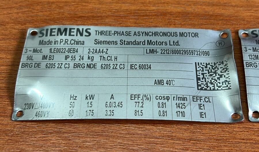 Tomemos como ejemplo esta placa de motor Siemens 1LE0022 para explicar cada elemento: